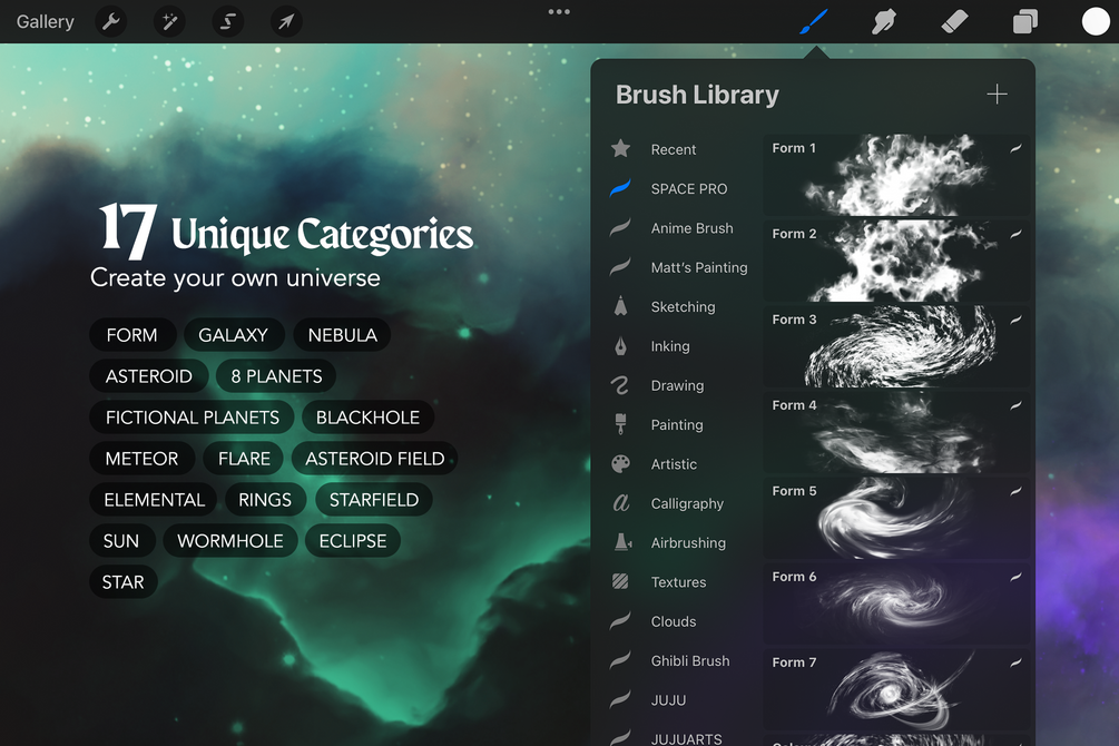 Be the god of the universe with these carefully crafted and high-quality space brushes. Create massive galaxies and black holes with high-resolution brushes. Compatible with both Procreate and Photoshop. With 90 total brushes and 30+ fully rendered elements, you'll never run out of cosmic ideas.