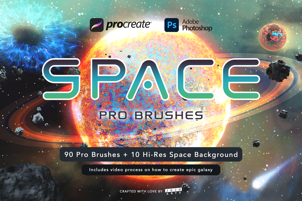 Be the god of the universe with these carefully crafted and high-quality space brushes. Create massive galaxies and black holes with high-resolution brushes. Compatible with both Procreate and Photoshop. With 90 total brushes and 30+ fully rendered elements, you'll never run out of cosmic ideas.